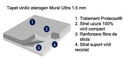 Tapet vinilic eterogen, cu tratament de suprafata Protecsol®, ranforsat cu o retea de fibra de sticla pentru rezistenta la impact si stabilitate dimensionala, Grosime totala 1,5 mm si strat de uzura 100% vinil de 0,65 mm pentru o durabilitate extinsa in timp.